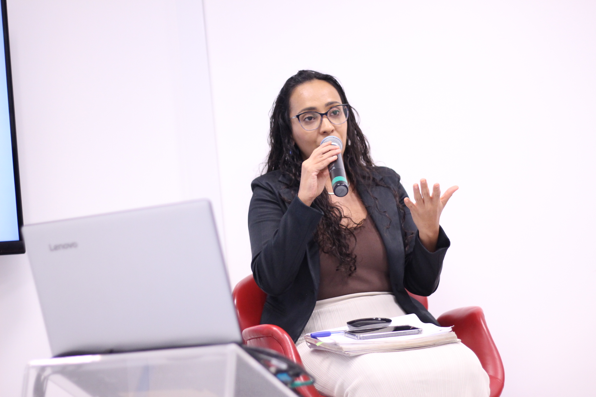 Suelem Benício, coordenadora adjunta do GT Gênero, representou a coordenadora Angélica Fernandes e pontuou que o grupo busca uma sinergia entre o trabalho do TCMSP, as pesquisas e as questões que são discutidas no âmbito mais geral da sociedade, como a distribuição da população feminina; fecundidade; participação das mulheres na Administração Pública Municipal e vereadoras eleitas para a Câmara Municipal; equipamentos de atendimentos às mulheres; despesas com políticas de proteção à mulher; atendimento às mulheres e despesas líquidas e programa de Metas e a Agenda Municipal 2023.