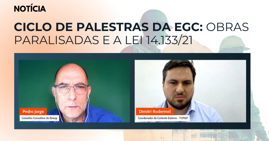 A Escola de Gestão e Contas Públicas (EGC), vinculada ao Tribunal de Contas do Município de São Paulo deu início ao Ciclo de Palestras “Auditoria de Obras Públicas”, especialmente voltado para abordar as diversas temáticas relativas à fiscalização de obras do setor público. Na terça-feira (24/09), a primeira palestra da série tratou de questões envolvendo as obras paralisadas e a aplicação da Lei 14.133/2021, a Nova Lei de Licitações e Contratos (NLLC). Com apoio do Instituto Brasileiro de Auditoria de Obras Públicas (Ibraop), o evento foi realizado ao vivo e teve transmissão pelo canal do YouTube da Escola.