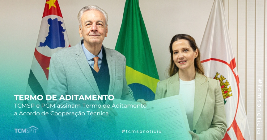 Na manhã desta terça-feira (1º), o presidente do Tribunal de Contas do Município de São Paulo (TCMSP), conselheiro Domingos Dissei, e a procuradora Geral do Município, Luciana Sant’Ana Nardi, assinaram o segundo Termo de Aditamento ao Acordo de Cooperação Técnica nº 001/2019 firmado entre o Tribunal de Contas do Município de São Paulo (TCMSP) e a Procuradoria Geral do Município (PGM). O objetivo do Acordo é a promoção do intercâmbio de dados e a conjugação de esforços para aperfeiçoar a atuação das duas instituições, facilitando o intercâmbio de informações de suas bases de dados.