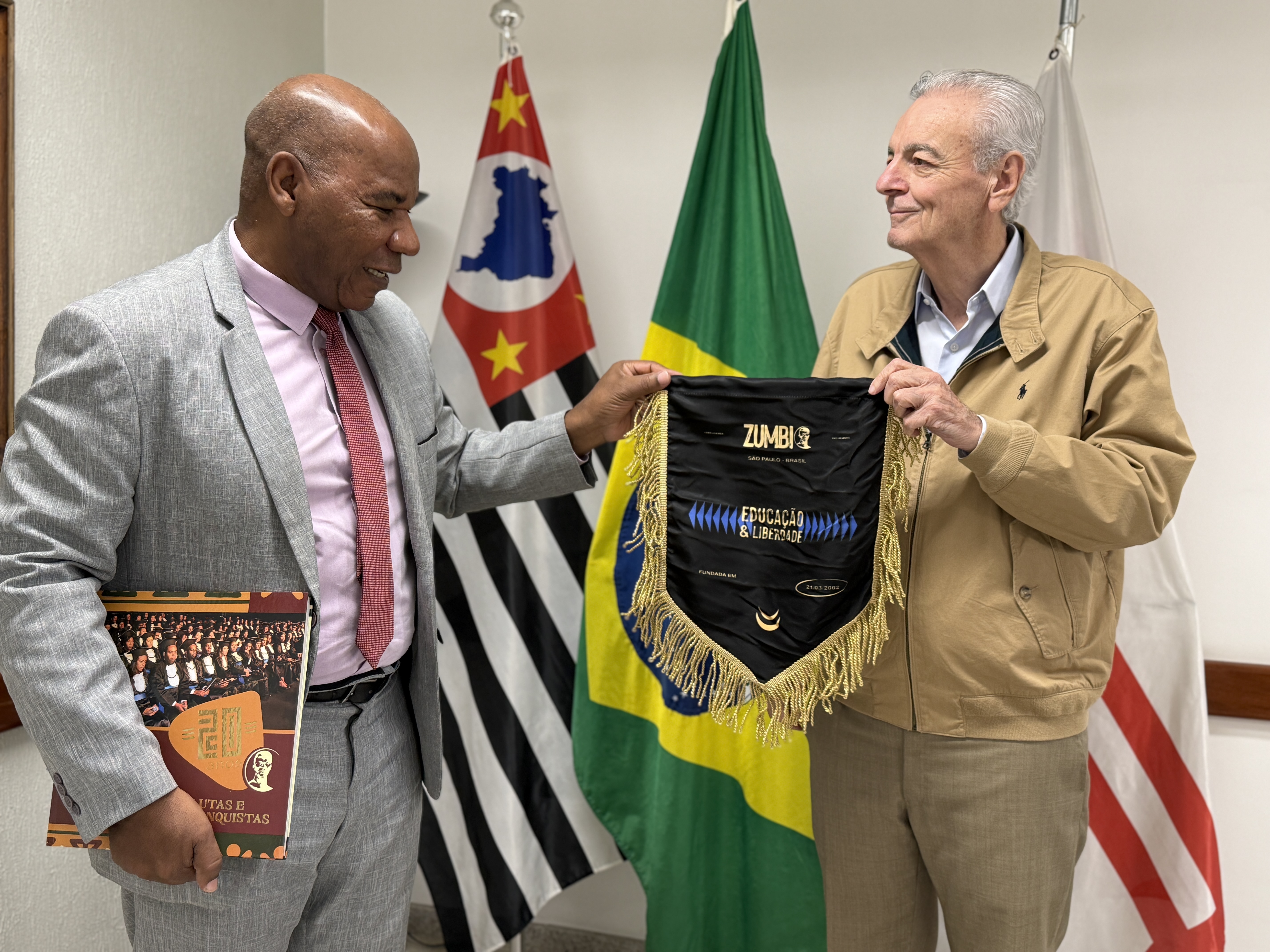 Como gesto simbólico, o reitor entregou ao presidente uma flâmula comemorativa pelos 20 anos da Universidade Zumbi dos Palmares, cujo lema é “Sem educação não há liberdade”. Segundo Vicente, o acesso ao conhecimento é essencial para que o indivíduo alcance a liberdade plena e possa transformar sua realidade por meio da educação.