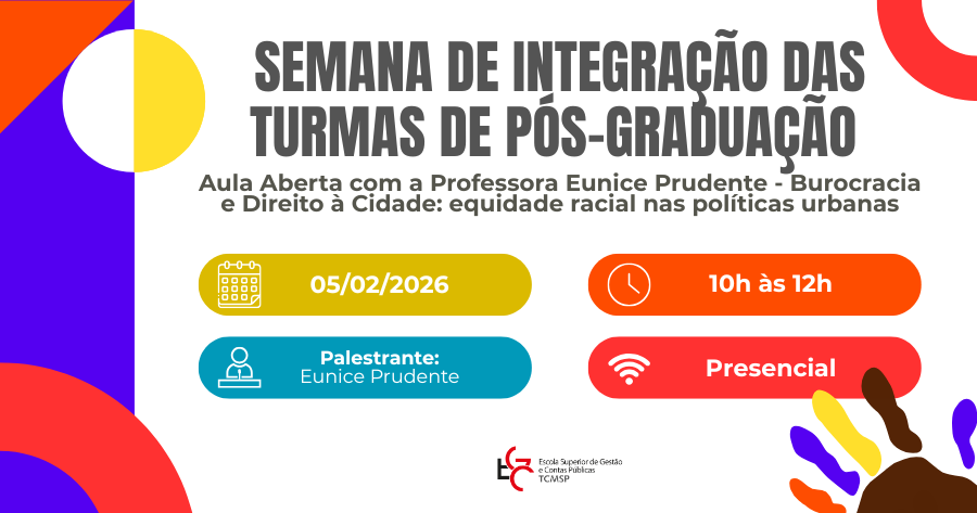 O dia 05/02 será dedicado a duas Aulas Abertas com a professora Eunice Prudente, referência em Direito Constitucional e Direitos Humanos. A proposta é promover reflexões sobre equidade, cidadania e políticas públicas, conectando teoria e prática na gestão pública e no planejamento urbano.